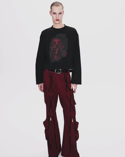 A bold clash of grunge nostalgia and sharp attitude, the Distressed Print Longsleeve is cut for a cropped, boxy silhouette that amplifies presence and tension. Crafted from premium cotton jersey, the piece features broad shoulders with subtle padding and an oversized chest graphic with a cracked, worn-in texture that evokes defiance and decay.