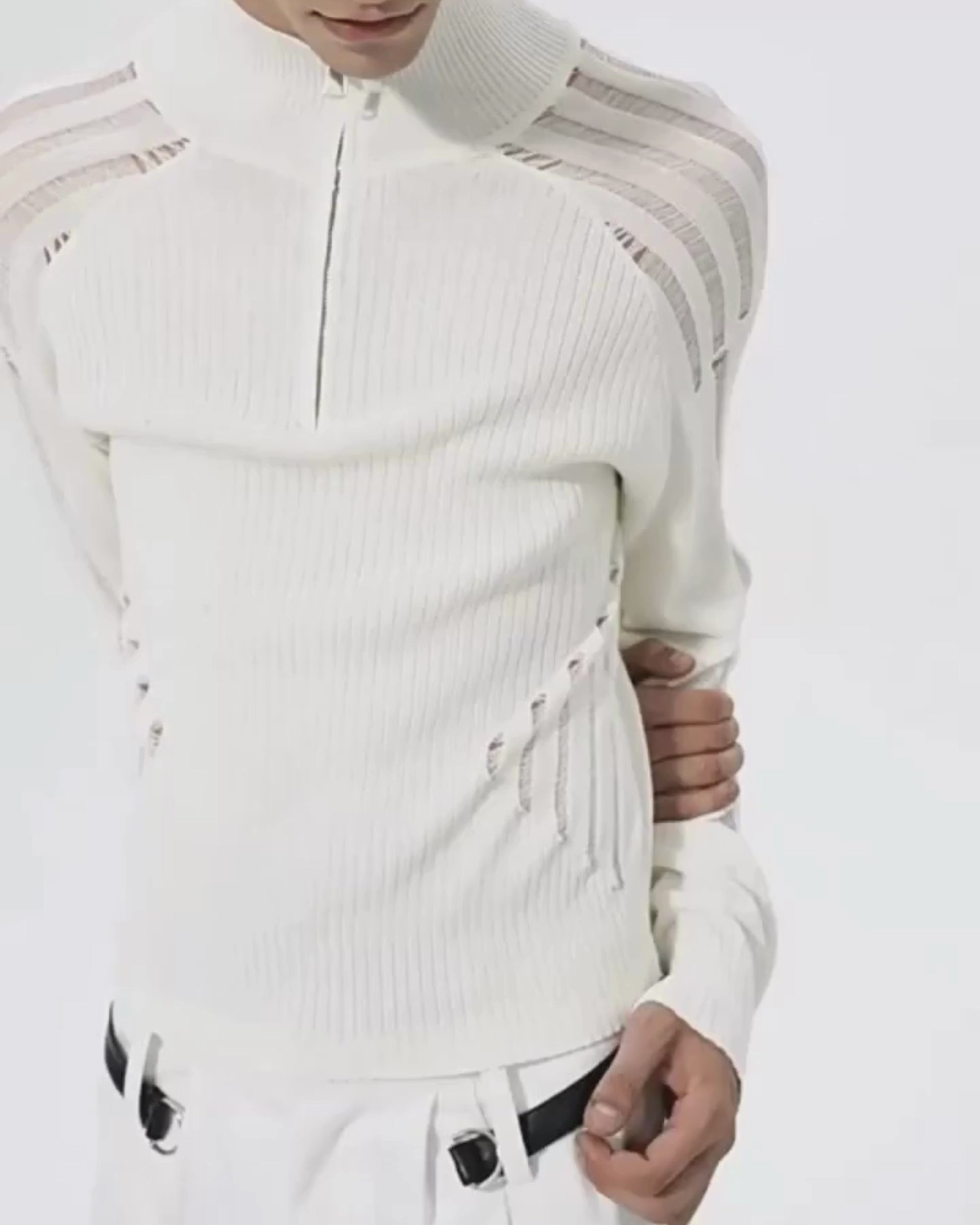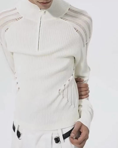 Fusing sculptural knitwear with anatomical edge, the Shredline Knit Pullover reimagines the classic pullover through a distorted, cyber-inspired lens. Made from a breathable ribbed stretch knit, the silhouette hugs the body while strategically placed laddered mesh inserts expose the skin in linear waves — like ruptures through fabric.