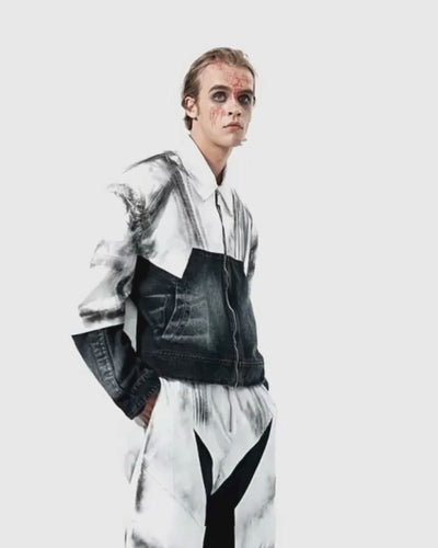 The Specter Fade Wide-Leg Pants are a visual rebellion against conventional denim. Sculpted with a striking flare and an exaggerated wide-leg silhouette, these pants distort traditional tailoring with bold contour inserts and a stark monochrome palette.
