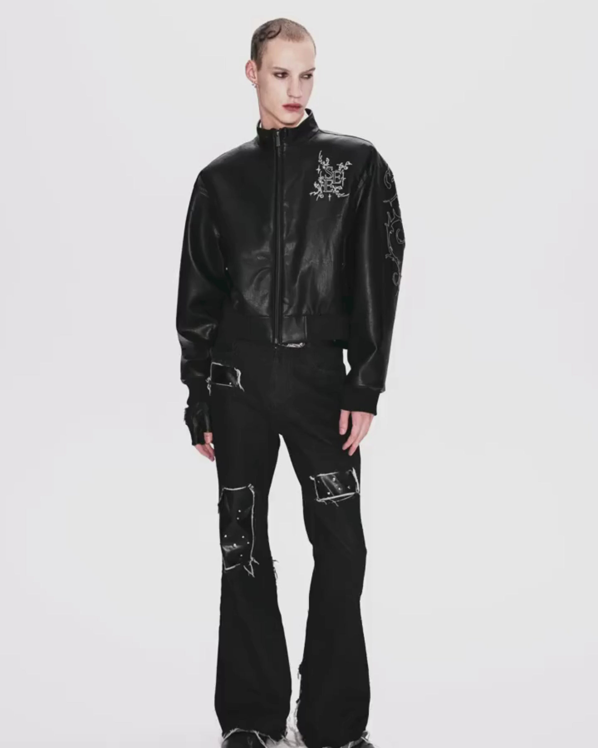 The front is minimal with clean paneling and a high-neck zip closure, while the back makes a maximalist statement: oversized “55” studs and gothic embroidery rise over the shoulders and hem, screaming with unapologetic confidence. Stylized embroideries on the sleeves and chest mark the piece with rebellious ornamentation, creating a visual balance between mysticism and aggression.